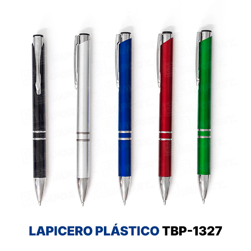 - Lapicero plástico retráctil de cuerpo de colores satinados, con punta, anillos centrales y clip de color plateado brillante. Color de tinta azul.