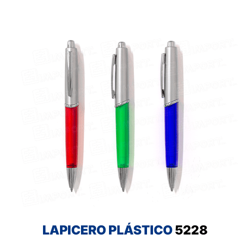 - Lapicero plástico retráctil de color traslúcido, con goma antideslizante en la base de color negro, con punta y clip color plateado brillante. Color de tinta azul.