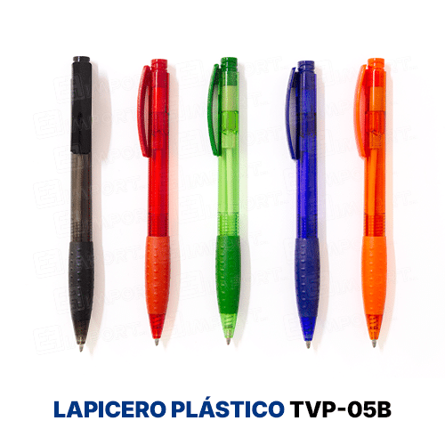 - Lapicero plástico retráctil de color traslúcido, con goma antideslizante en la base y clip de color sólido. Color de tinta azul.