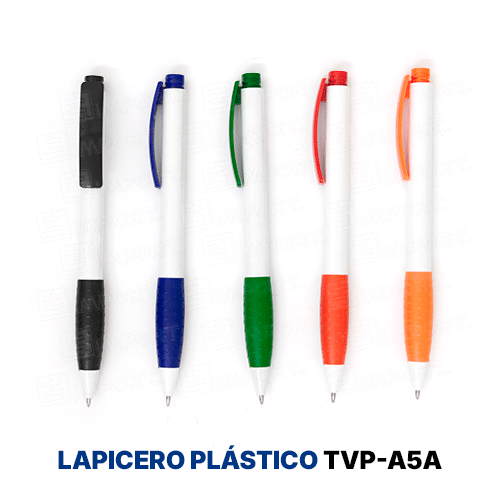 - Lapicero plástico retráctil, con con goma antideslizante en la base y clip de color sólido. Color de tinta azul.