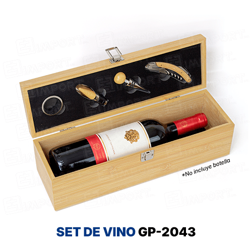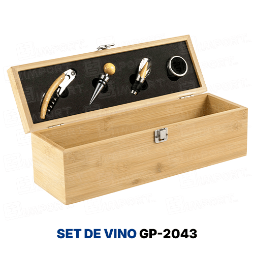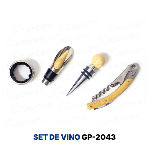 - Set de vino de 4 piezas. El set incluye sacacorchos y destapador, vertedor de vino, tapón de vino y recoge gotas. Compartimento interior para botella de vino, no incluida.
